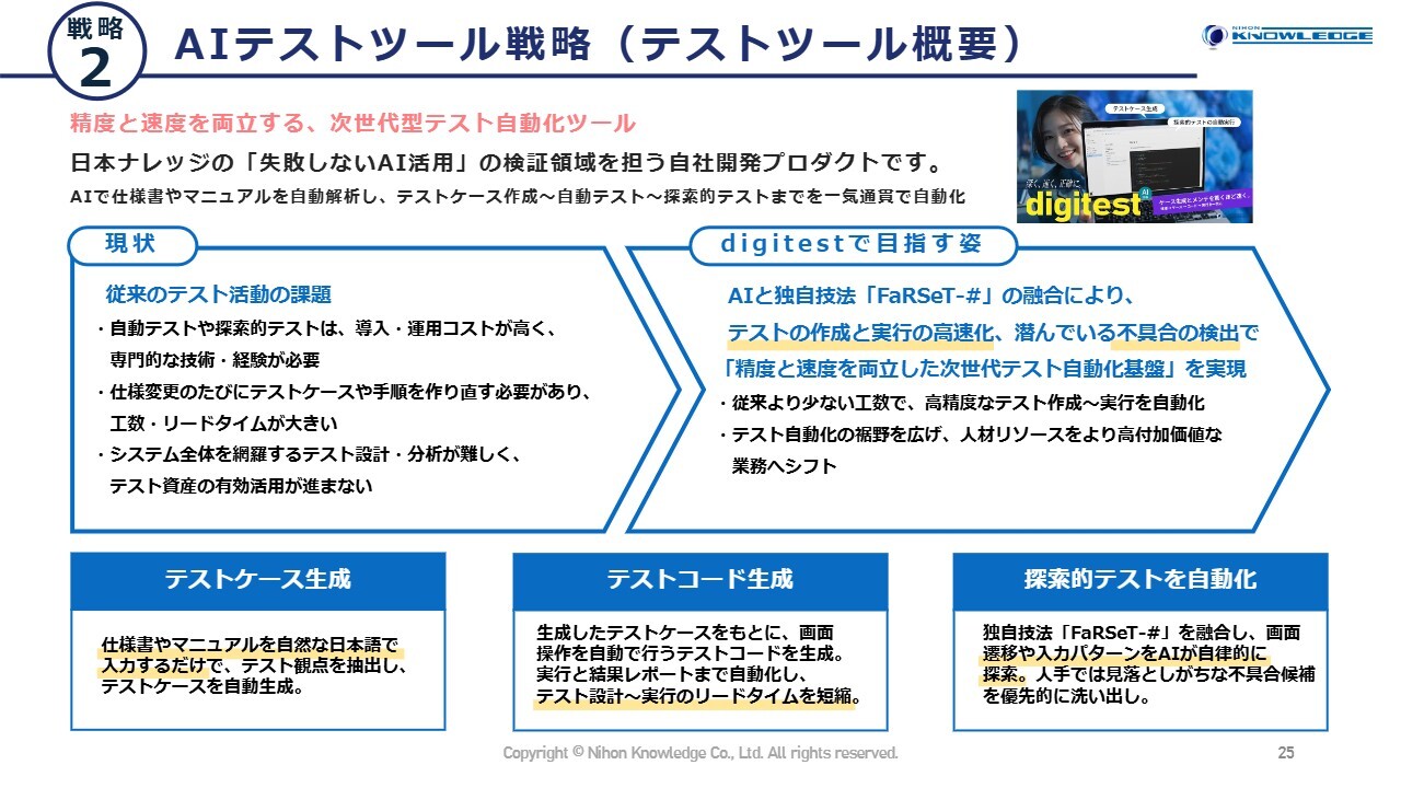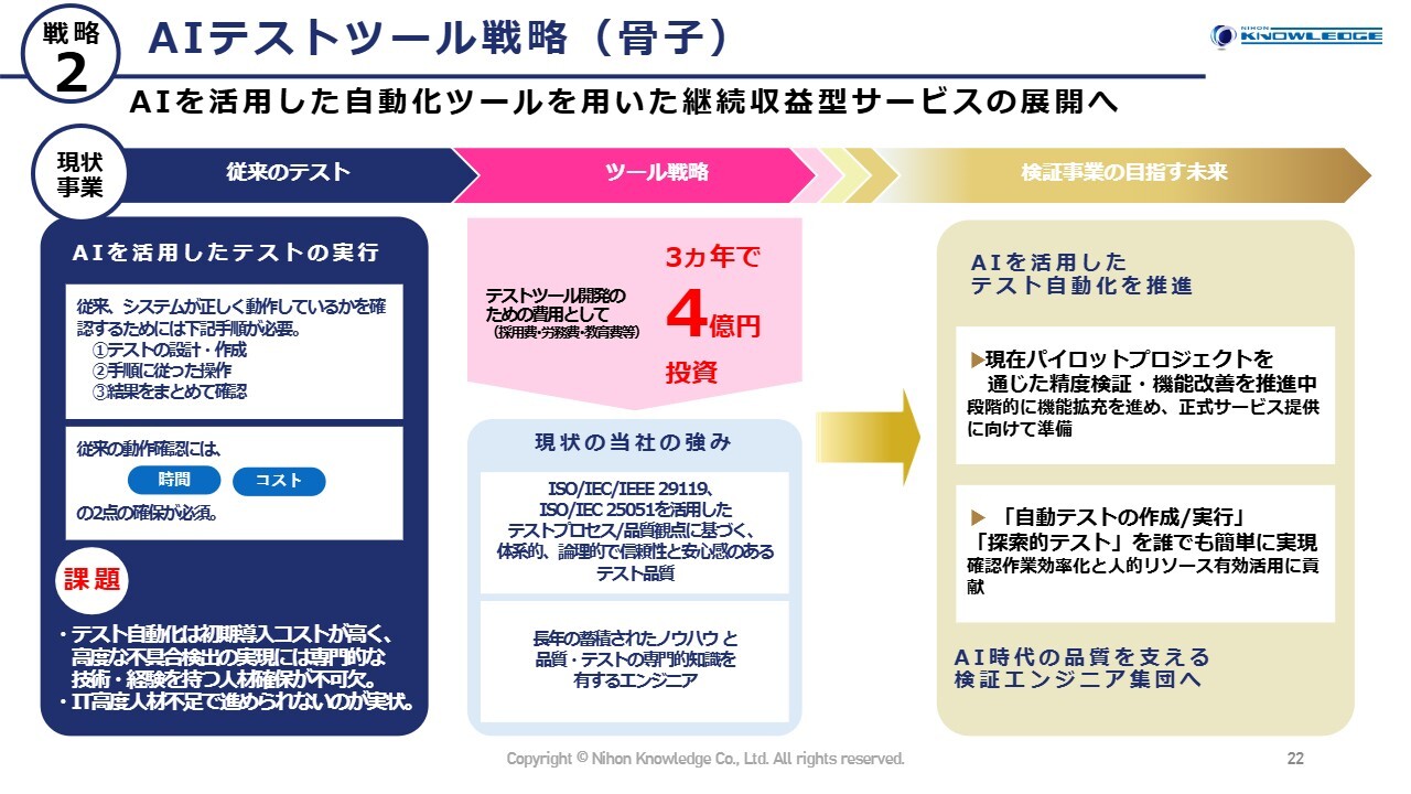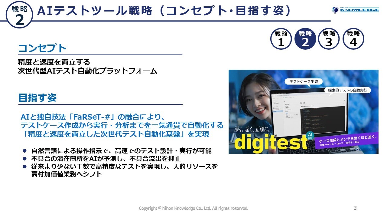 重点戦略の2つ目は、AIテストツール戦略です。これまでテストの自動化を進めてきましたが、さらに一歩進めてAIを活用し、精度と実行速度を一層高めることで、顧客に貢献するサービスです。