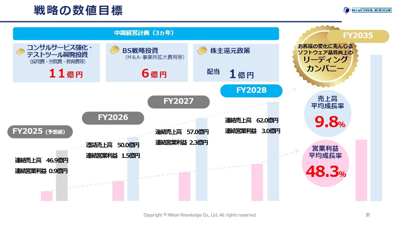 2028年度においては、売上高62億円を目指します。3ヶ年の平均成長率は9.8パーセントとなり、営業利益は48.3パーセントと大幅な成長を見込んでいます。