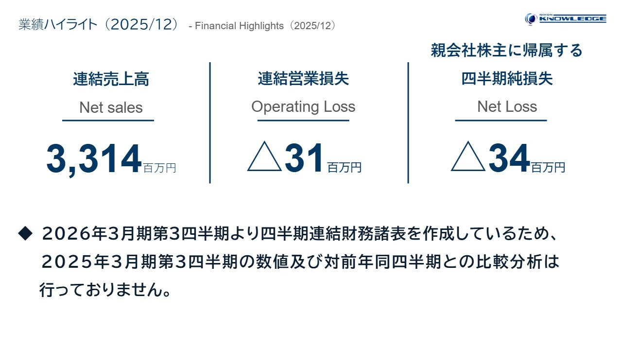 業績ハイライトです。本第3四半期よりアルテックス社を完全子会社化したことに伴い、連結決算となりました。そのため、前年同四半期との比較分析は行っていません。