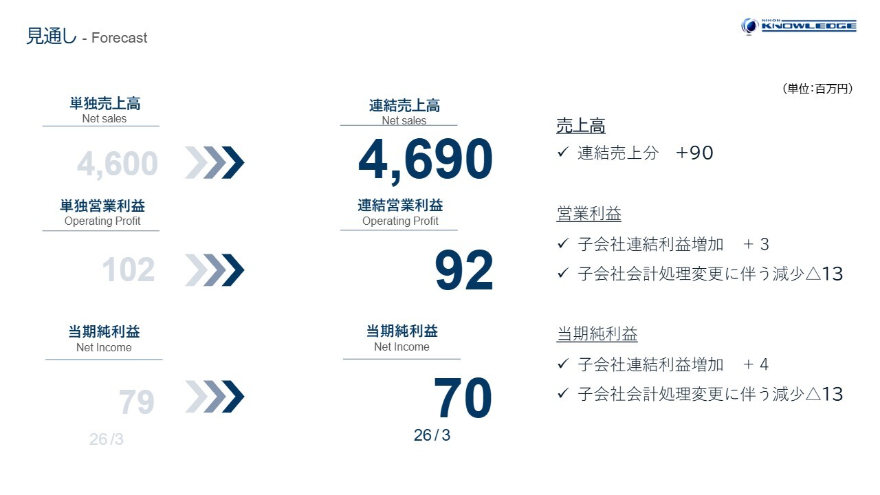 業績見通しです。今期の日本ナレッジ単体の業績見通しに変更はありませんが、連結では若干修正しています。売上高は46億9,000万円、営業利益は9,200万円、純利益は7,000万円を見込んでいます。