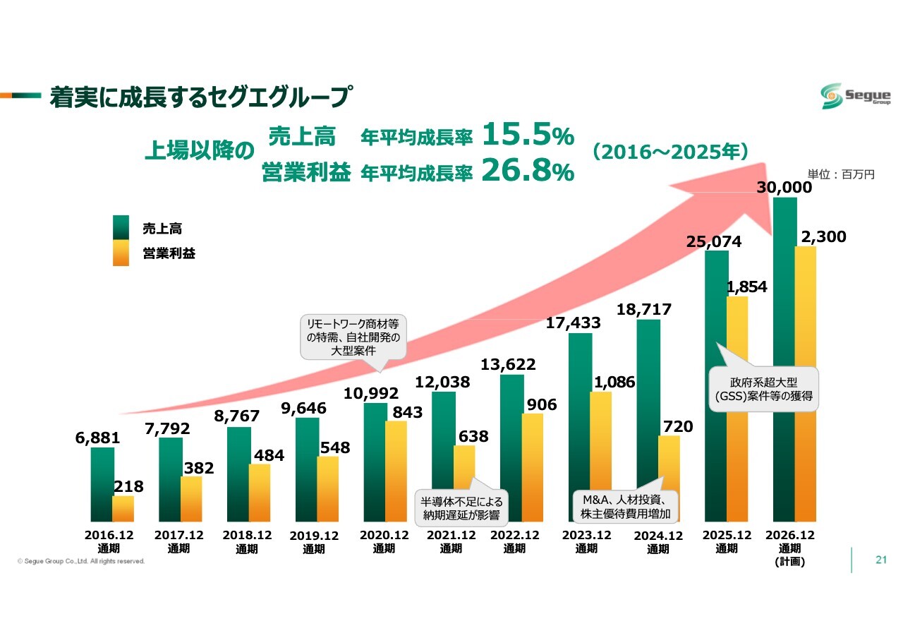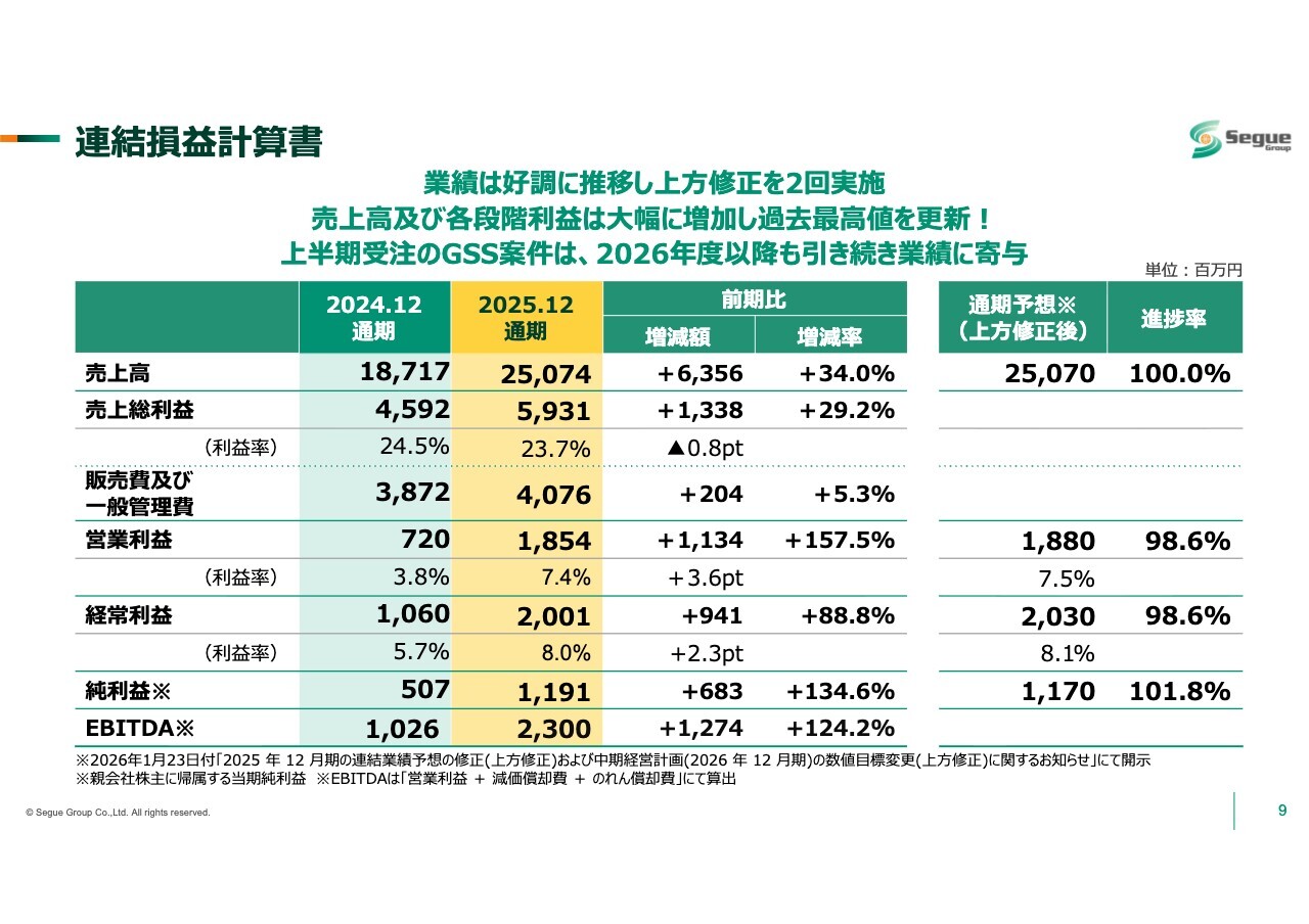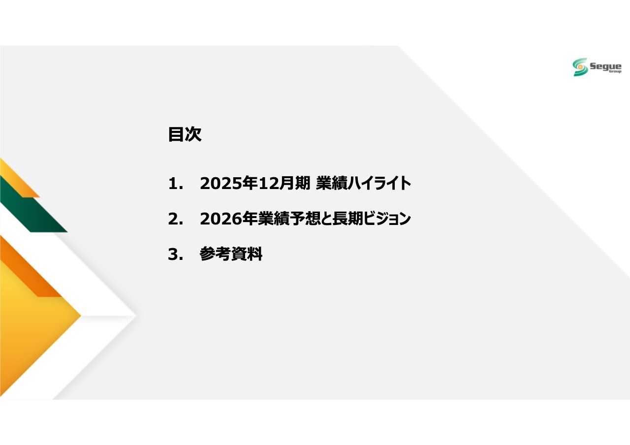 愛須康之氏(以下、愛須):みなさま、こんにちは。セグエグループ代表取締役社長の愛須です。本日はお忙しい中、当社の決算説明会にご参集いただきありがとうございます。私から、2025年12月期の業績ハイライトと、2026年12月期の業績予想と長期ビジョンについてお話しします。よろしくお願いします。
