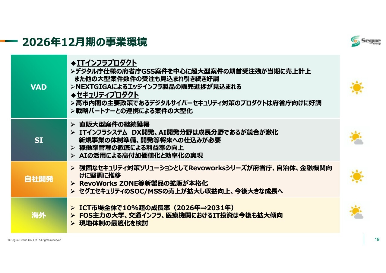 2026年12月期の事業環境と予測についてご説明します。ITインフラプロダクトについては、デジタル庁仕様のGSS案件を中心に受注残高があることに加え、新規も獲得しています。これにより、売上を大きく伸ばすことができると考えています。また、「GIGAスクール」「NEXT GIGA」により、Wi-Fiやエッジインフラ製品の販売が進捗すると見込んでいます。