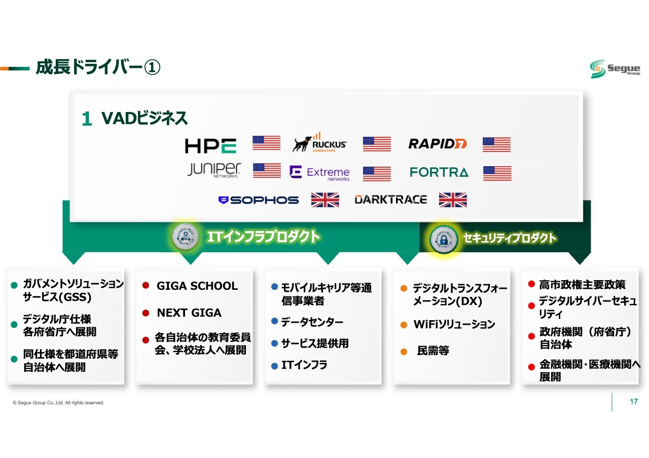 当社ビジネスの成長ドライバーについてです。1つ目はVADビジネスです。米国の製品を中心に、英国、イスラエルなどの海外メーカーから最先端のセキュリティ商材やITインフラ製品を輸入し販売しています。メーカーとの信頼関係に加え、日本のIT業界をリードする企業とのアライアンス強化に向けた施策が実ってきていることから、この分野をさらに大きく成長させることができると考えており、政府系の案件も獲得できると見込んでいます。