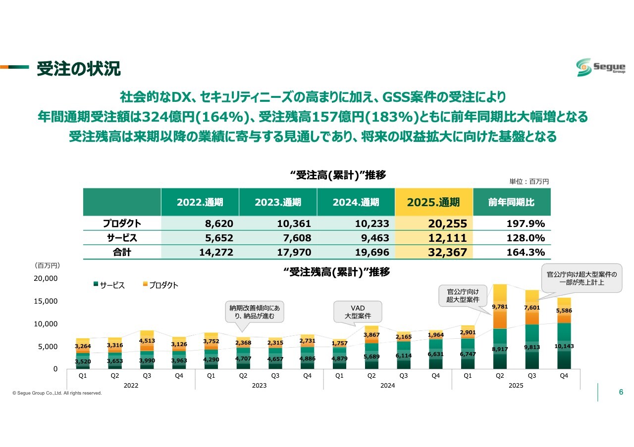 スライド下の棒グラフは受注残高を示しています。第2四半期には、オレンジ色のプロダクトの受注が大きく伸びました。これはGSSの大型案件によるものです。その後、少しずつ売上として計上され、プロダクトの受注残高は徐々に通常の水準に戻りつつありますが、2026年12月期も引き続き大型案件の獲得を増やし、受注残高を確保しながら成長を目指したいと考えています。