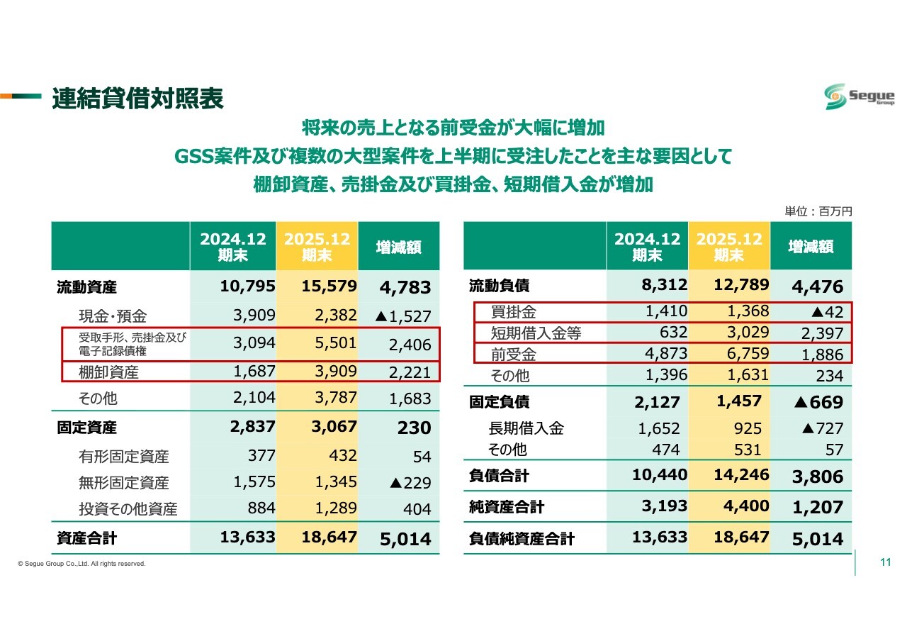 負債については、短期借入金等が前年同期比で大きく増加しています。特にご注目いただきたいのは、スライド右側4行目の前受金です。これは年間契約、システムによっては5年分を一括で受注して売上を計上した後、いったん売上を取り消し、月次按分で毎月売上として計上されます。このため、前受金の67億5,900万円は、2026年12月期以降に売上計上される予定の数値で、前年同期比では約19億円増加しています。