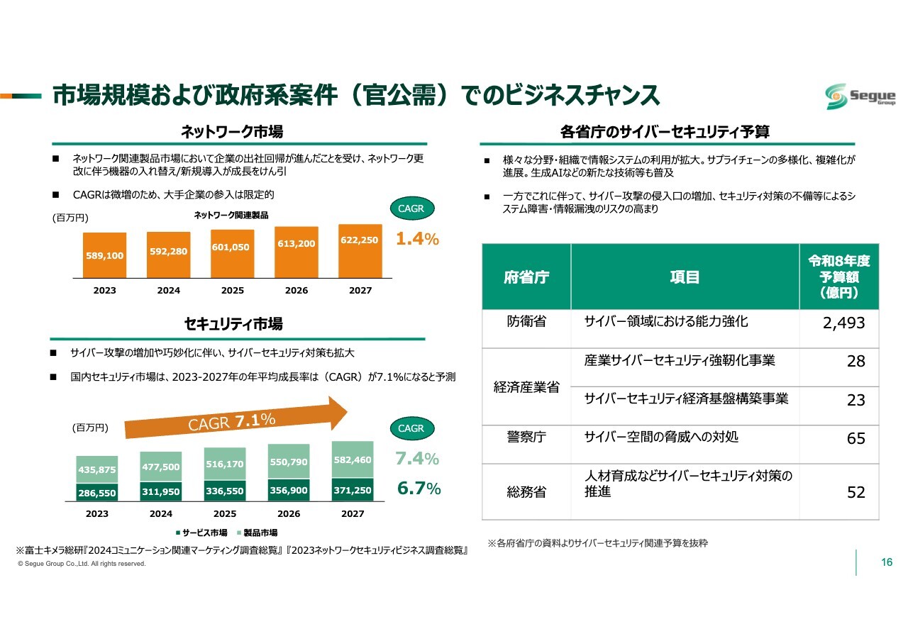 スライド右側には、府省庁のサイバーセキュリティ対策予算を記載しています。予算には人件費や関連費用が含まれていると推測されますが、防衛省の予算が特に多いことがわかります。その他の省庁でも10パーセントから前年度比で20パーセントの増額が見られます。高市政権においても、デジタルやサイバーセキュリティ対策への投資が推進されています。当社はこの分野にビジネスを集中させ、さらに伸ばしていきたいと考えています。