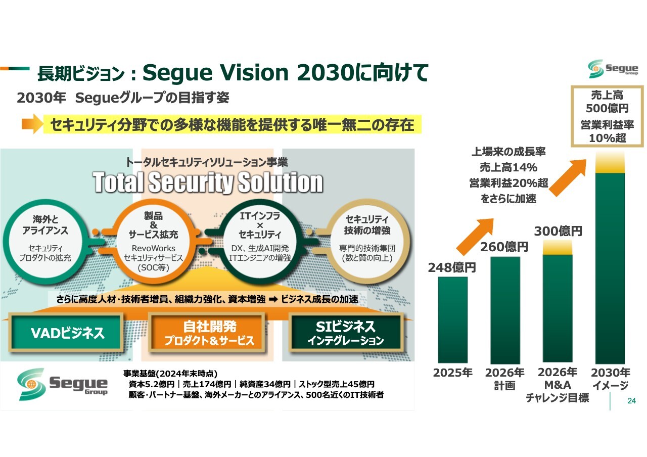 「Segue Vision 2030」についてご説明します。海外メーカーとのアライアンスを強化することで製品やサービスが拡充され、ITインフラやネットワークといった分野でセキュリティは欠かせなくなっています。