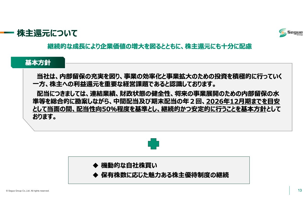 株主還元についてです。当社は、継続的な事業成長を通じて企業価値の増大を図りつつ、同時に株主さまへの還元にも十分に配慮していきます。