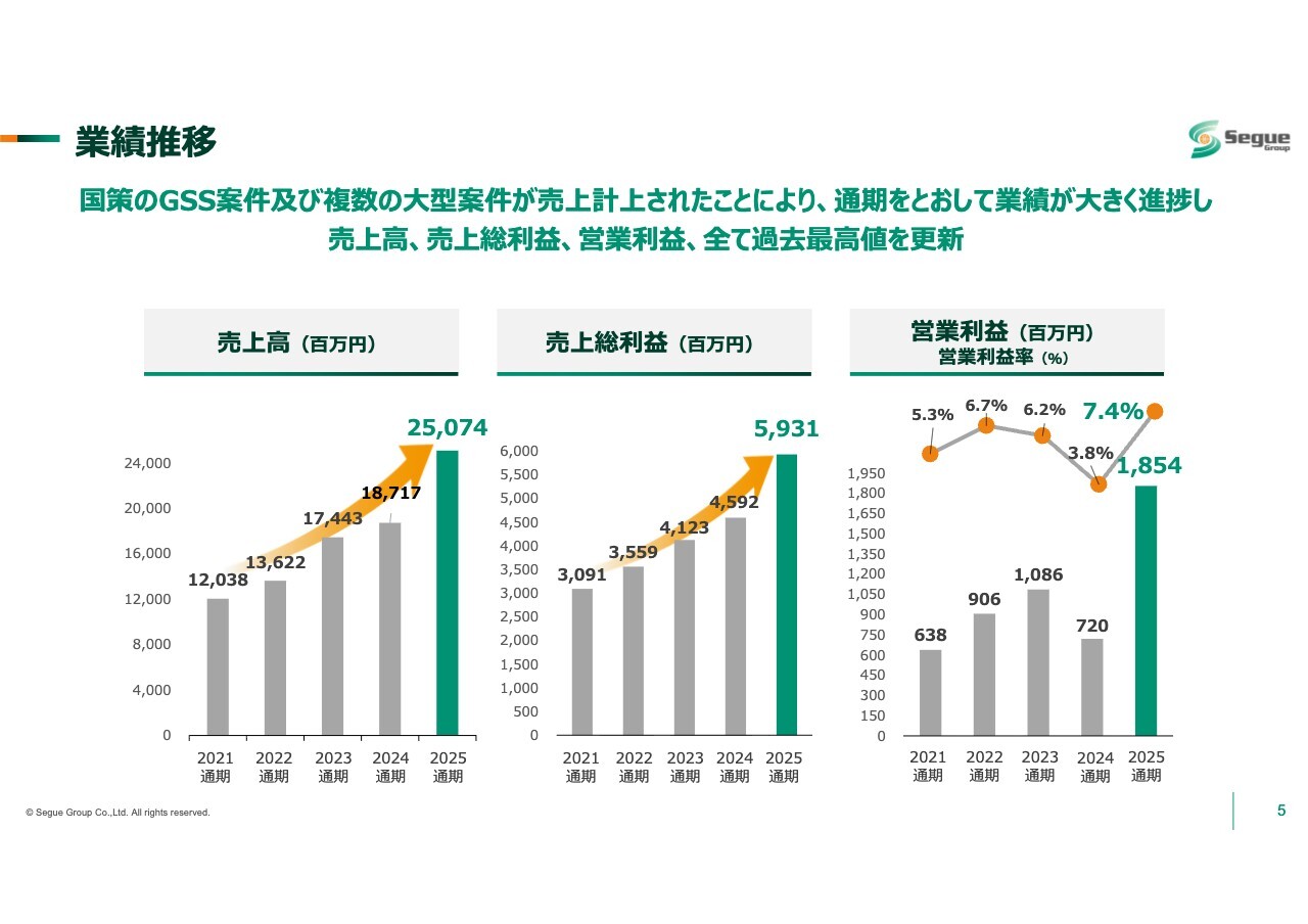 スライドは、直近5年間の売上高、売上総利益、営業利益の推移を示しています。例年はCAGR(年平均成長率)が約15パーセントでしたが、2025年12月期はさらに大きく成長することができました。また、大型案件を獲得したにもかかわらず営業利益も大きく伸び、営業利益率はここ数年で最高値を記録しています。