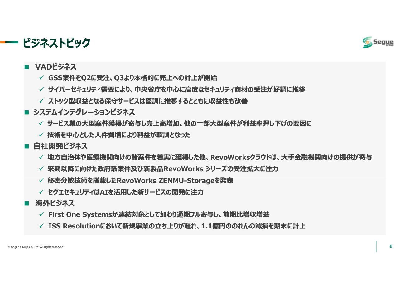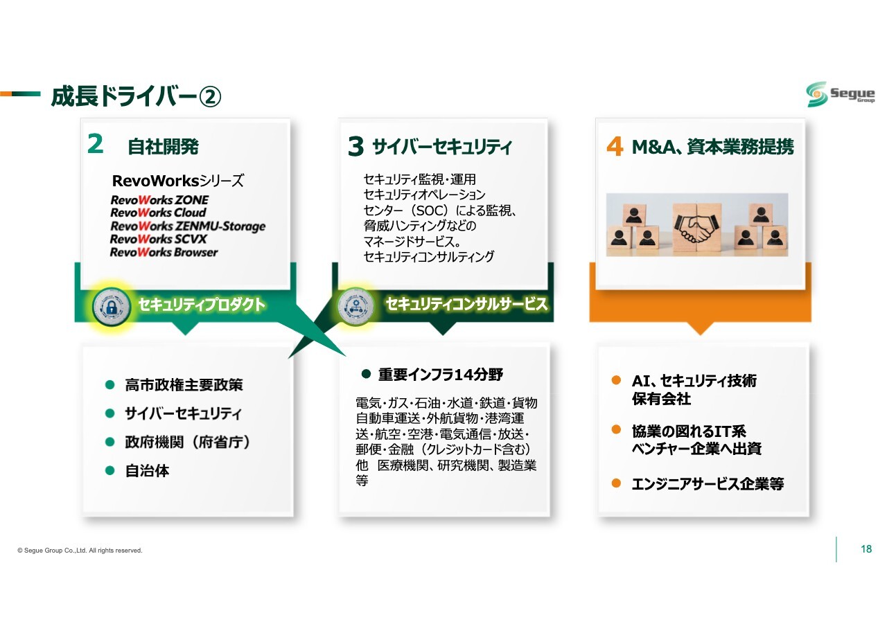 また、「RevoWorks ZONE」の新製品も販売が本格化してくる予定です。自社開発ビジネスを展開するセグエセキュリティの売上規模はまだ小さいものの、今後大きな成長につながると考えています。