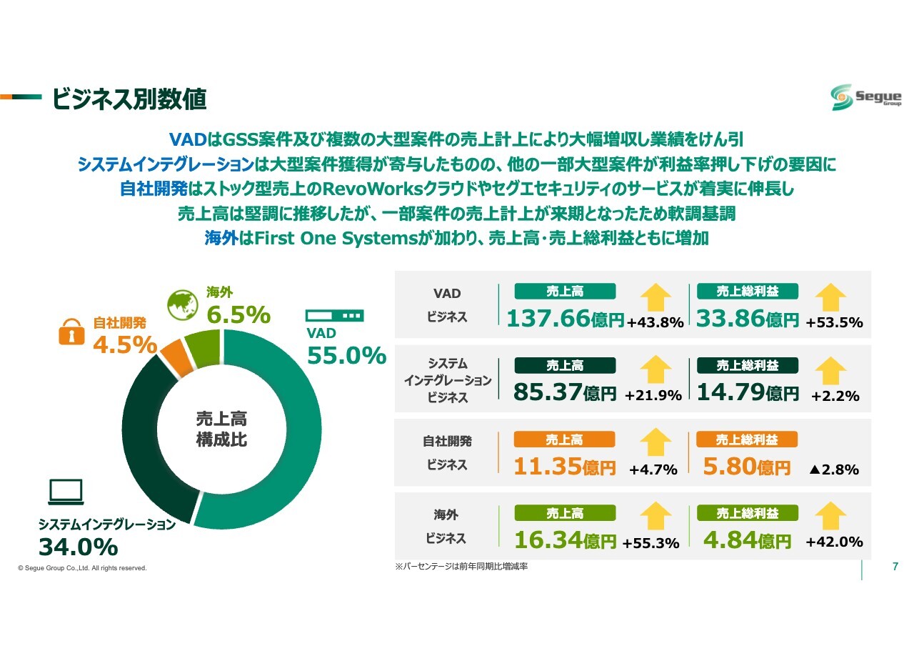 システムインテグレーションビジネスは、サービス業の大型案件を獲得しており、DX(デジタルトランスフォーメーション)の開発やシステム構築、プロフェッショナルサービスが含まれます。システムインテグレーションビジネスも大きく伸びていますが、可能な限り当社の強みである製品を組み合わせて提案しています。VADビジネスの製品を含む場合はVADビジネスの売上として計上されるため、システムインテグレーションビジネスの伸び率は若干低くなります。なお、売上総利益の前年同期比が売上高と比較して低いですが、これは低採算案件が1つあったことが要因です。