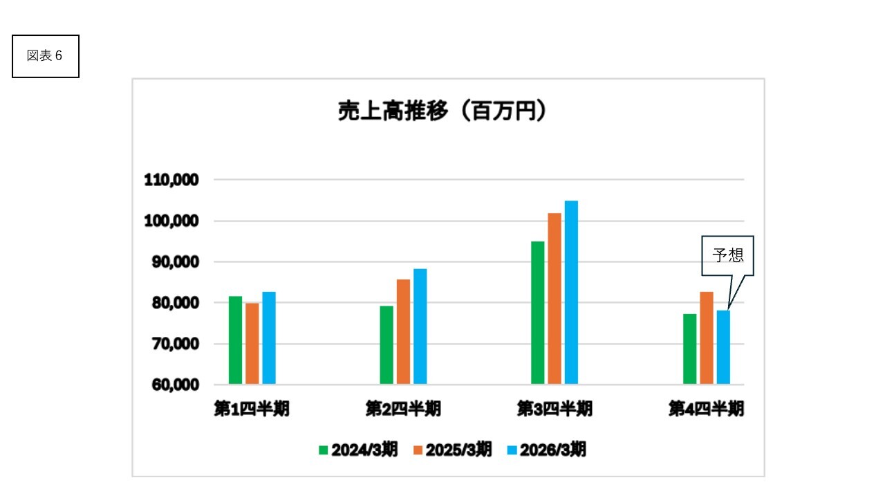 各四半期の売上高推移はスライドのとおりです。第3四半期が山になることが見て取れます。また第4四半期は最需要期の後となり、売上高も781億円程度と低調になると見込まれます。