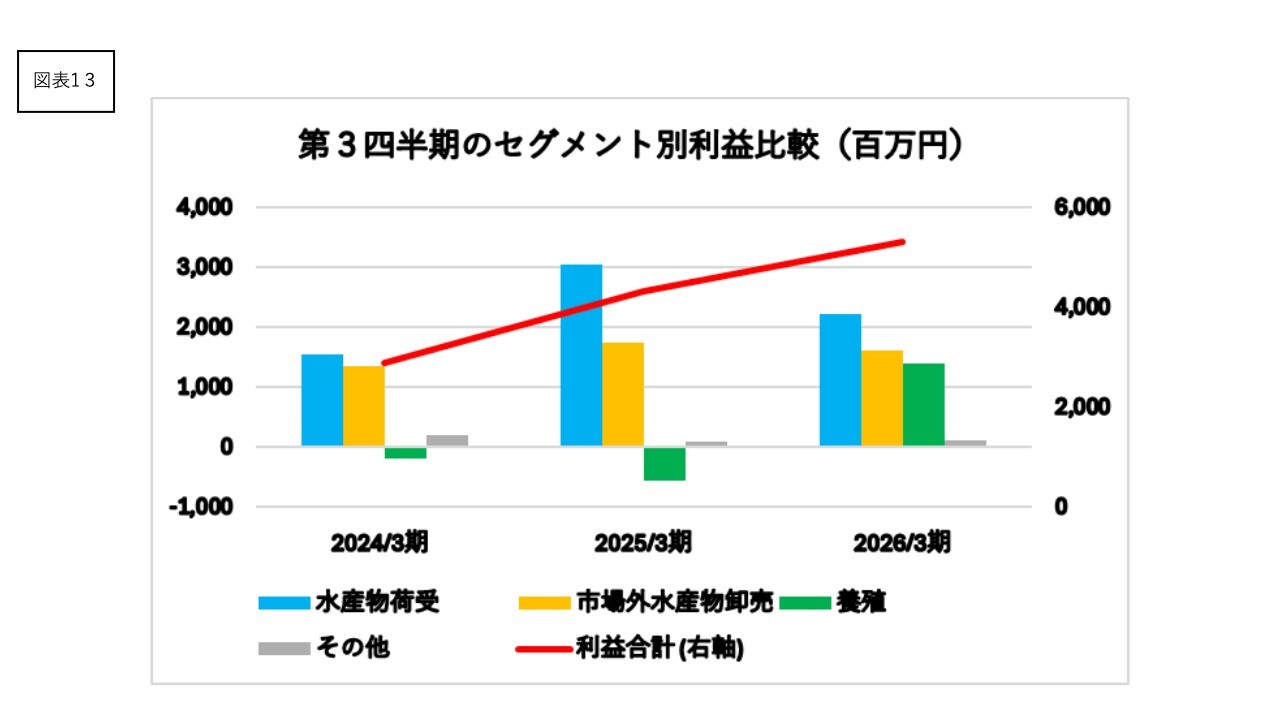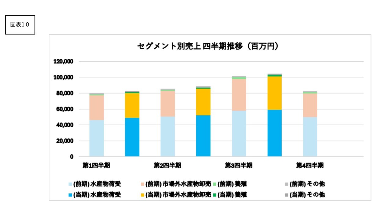 セグメント別利益(営業利益)では、水産物荷受事業と市場外水産物卸売事業は、経費上昇等により前年同期比減益となりました。