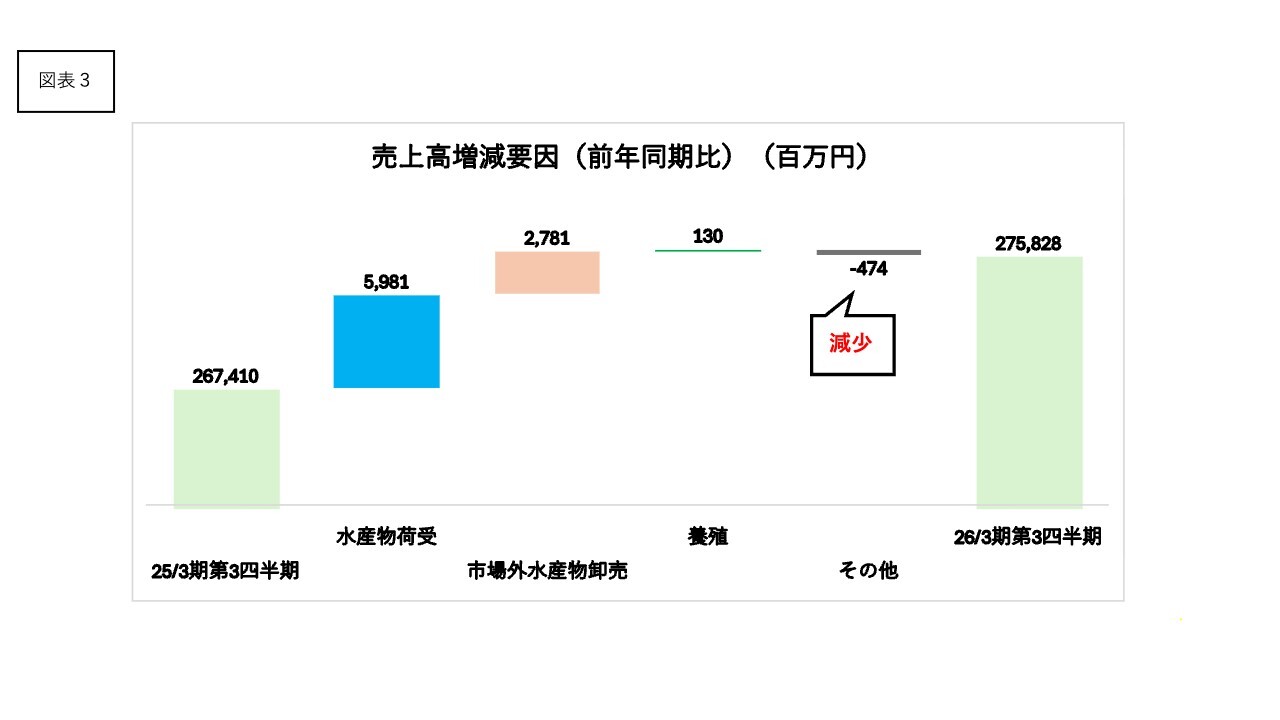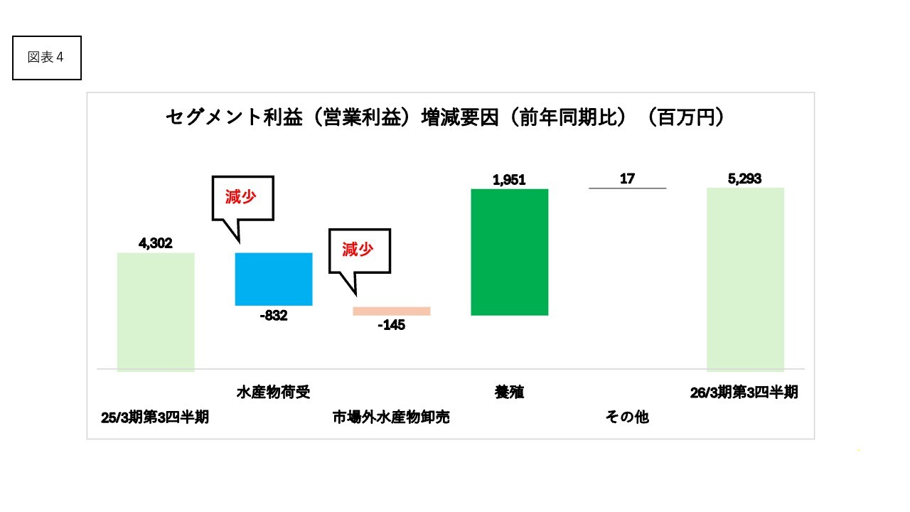 前年同期からの売上高のセグメント別増減は図表のとおりです。水産物荷受事業で59億円、市場外水産物卸売事業で27億円、養殖事業で1億円の増収となりました。