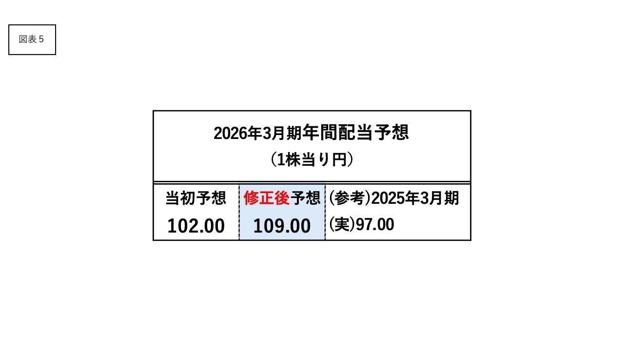 この基本方針と通期連結業績予想の修正を踏まえ、2026年3月期末分の配当予想を1株102円 から109円に引き上げます。