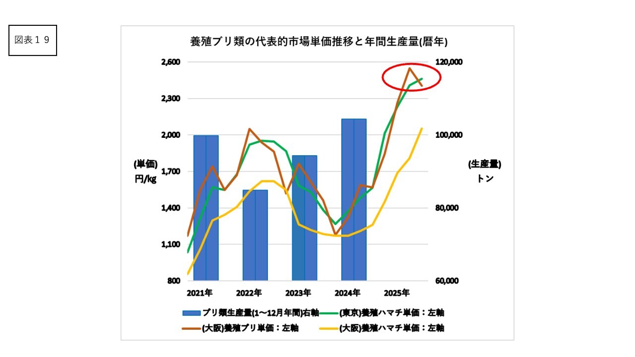 養殖ブリの市場単価と年間生産量の動向はスライドのような状況です。ブリの市場単価は最高値圏で推移しています。