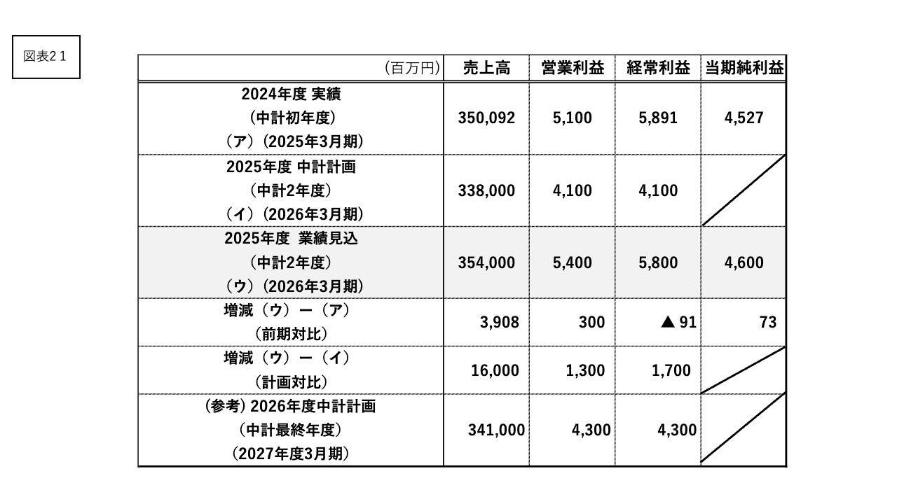 これらにより、前述のとおり、中計2年度目の計画対比で増収増益を見込んでいます。前年度2024年度実績対比では、食料品をはじめ諸物価や人件費の上昇に加えて、解消しない円安によるコスト上昇や一部商品の消費需要の減退が見られますが、総合的には増収および営業利益の増益を見込んでいます。