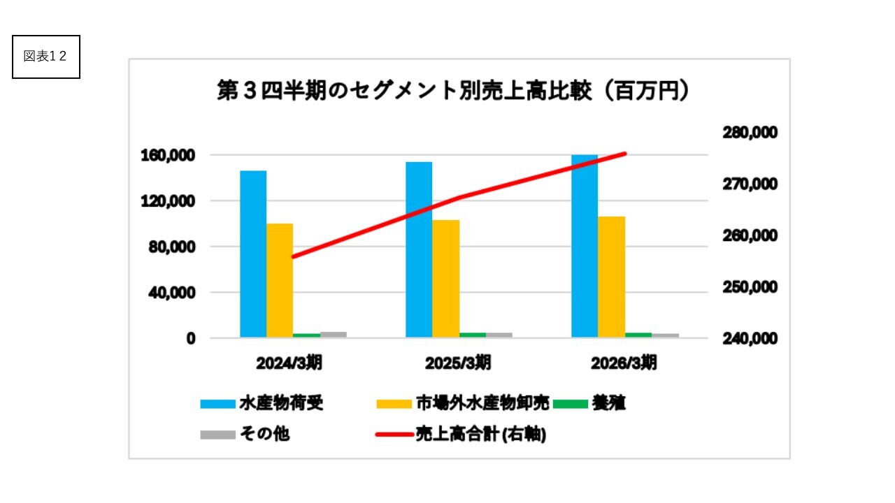 2026年3月期第3四半期は水産物荷受事業と市場外水産物卸売事業の販売増が寄与し、売上高は2,758億円となり前年同期比3.1パーセントの増収となりました。利益面では養殖ブリ事業の黒字が増益に大きく貢献し、経常利益は57億円となり前年同期比17.9パーセントの増益となりました。