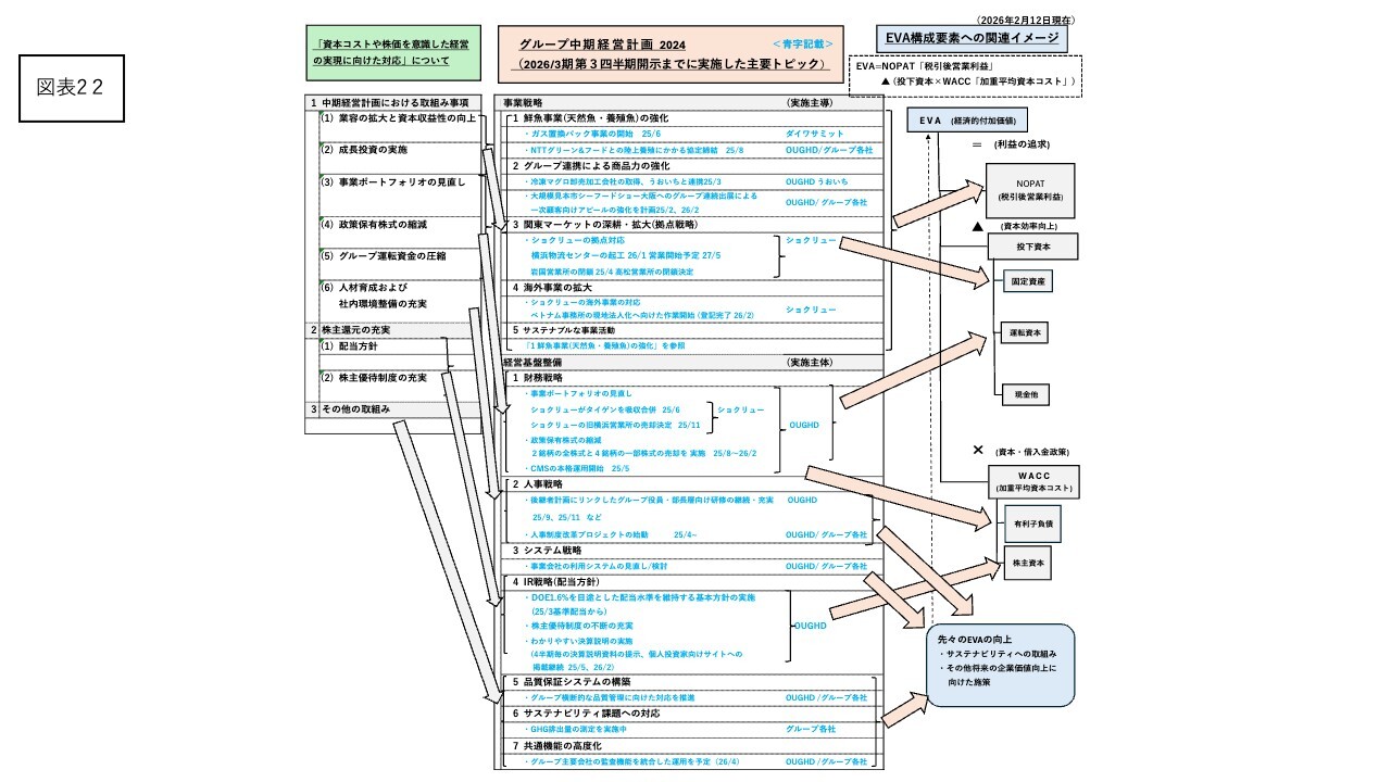 経営基盤整備の「1 財務戦略」では、事業ポートフォリオの見直しで、水産物卸売事業会社のショクリューは、2025年6月に自社の子会社、北九州の水産物仲卸会社である株式会社タイゲンを吸収合併したほか、2025年11月に同社の旧横浜営業所の売却を決定しました。政策保有株式の縮減では、2025年8月から2026年2月にかけて、経営環境・保有目的等を勘案し、政策保有株式を縮減し2銘柄を完全売却し、4銘柄について一部売却を行いました。