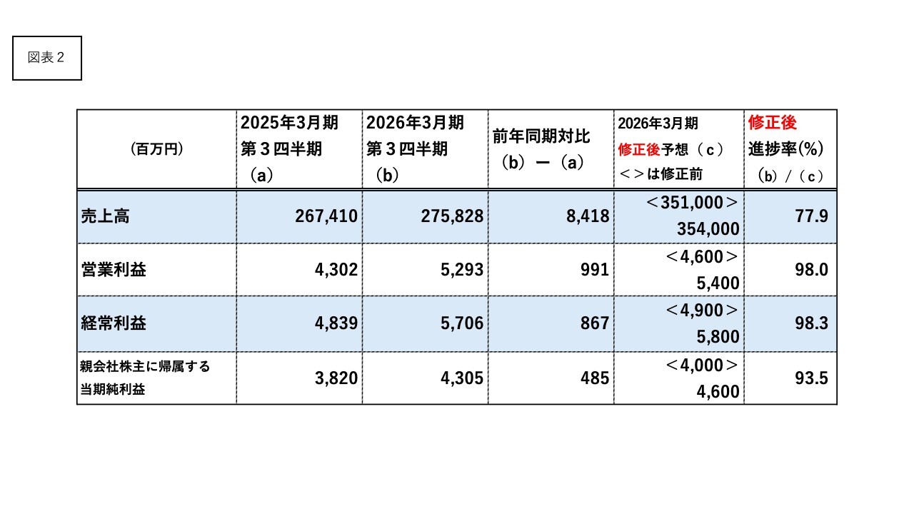 前述を踏まえ、通期連結業績予想を連結売上高は3,510億円から3,540億円に、同営業利益は46億円から54億円に、同経常利益も49億円から58億円に上方修正します。前ページのスライドを参照してください。