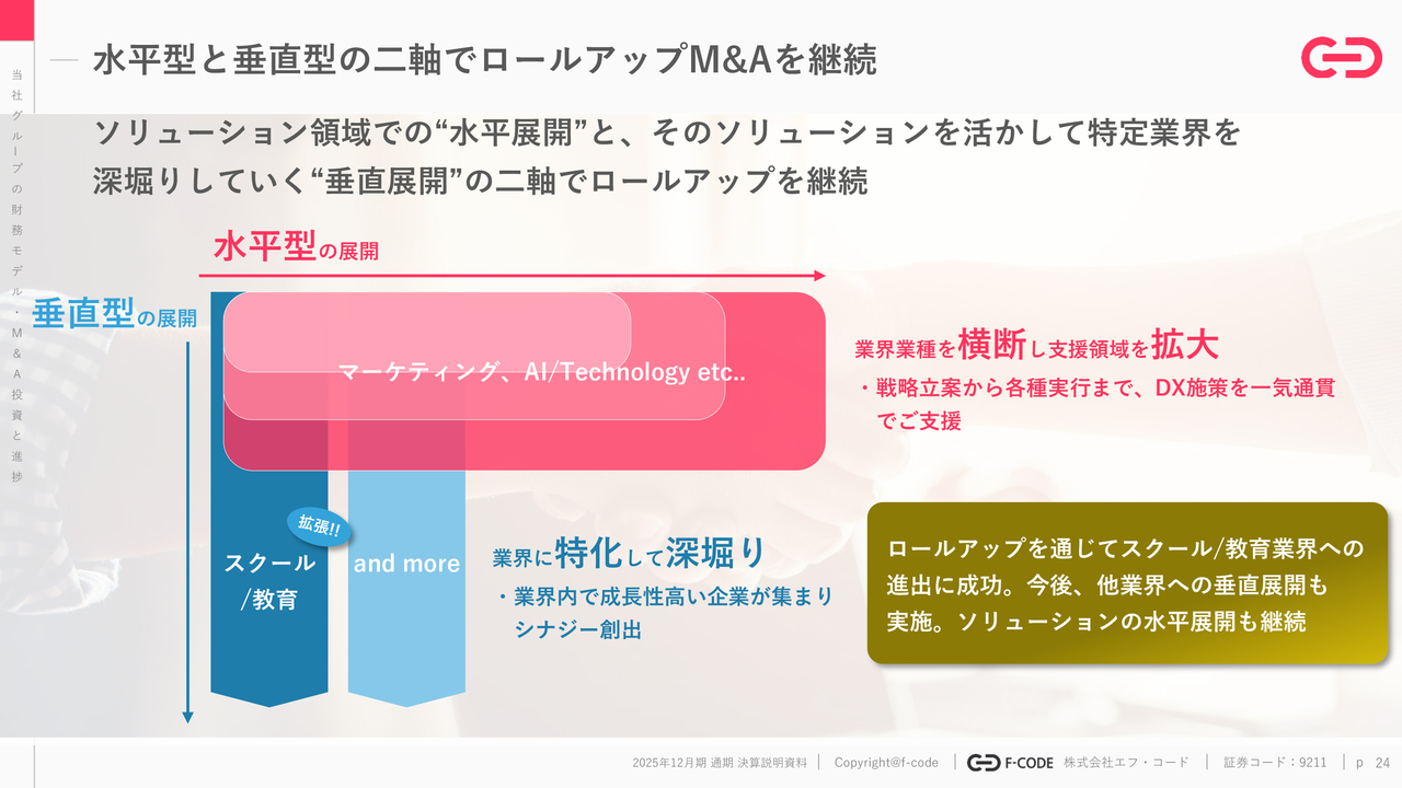 また、それらの強みを活かして、例えばスクールエデュケーションといった特定の業界をしっかりと深掘っていくためのロールアップを「垂直型」として実施しています。この2軸で展開していきたいと思っています。