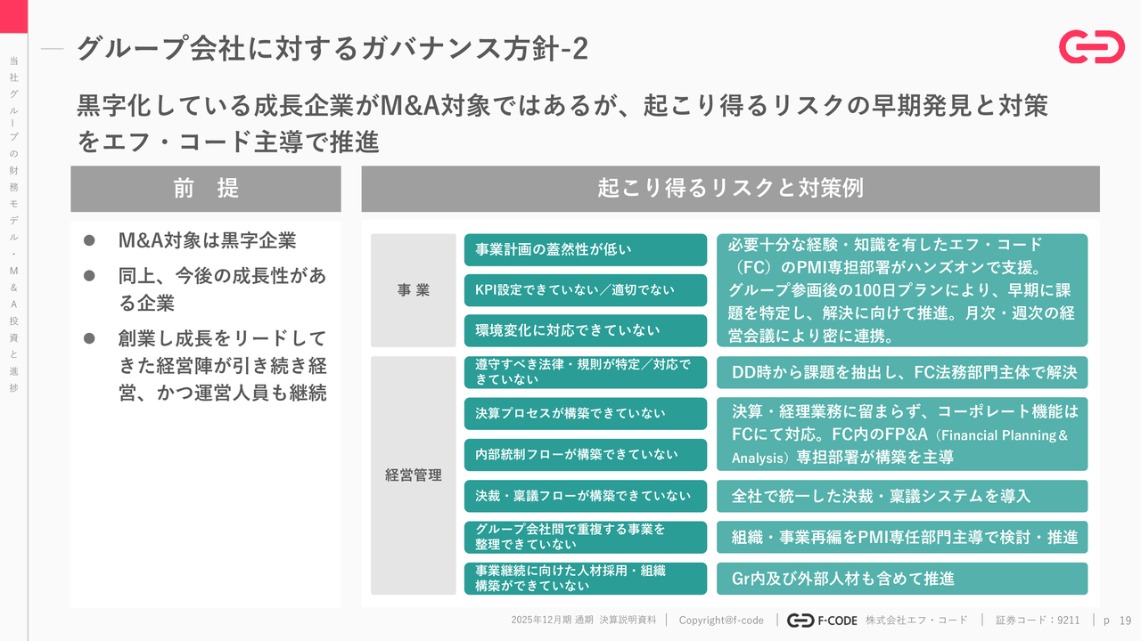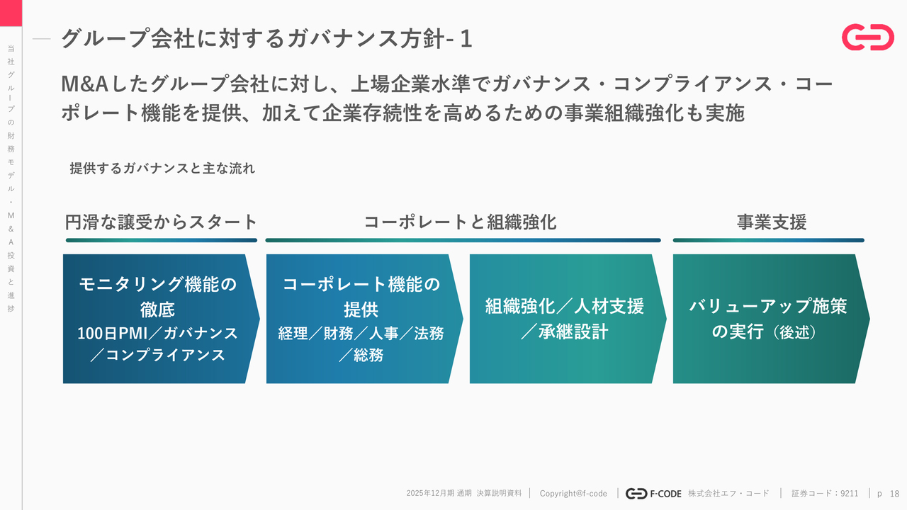 M&Aしたグループ会社に対するガバナンス方針についてです。まずは「円滑な譲受」ということがなによりも重要なので、モニタリング機能の強化、これはPMI、ガバナンス、コンプライアンス等が譲受後すぐに始まります。