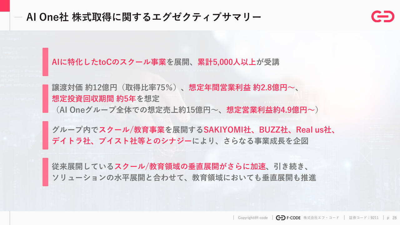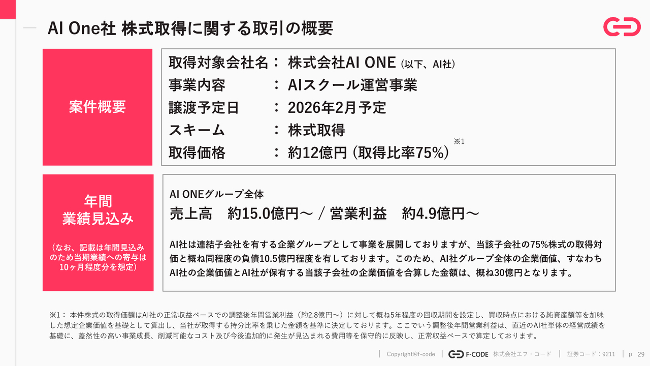 最後に、直近発表したM&Aについての補足説明を行います。AIに特化したスクール事業に関するもので、譲渡対価は約12億円、想定年間営業利益は約2億8,000万円です。ただし、AI Oneグループ全体で見ると、想定売上高が約15億円、想定年間営業利益が約5億円となります。