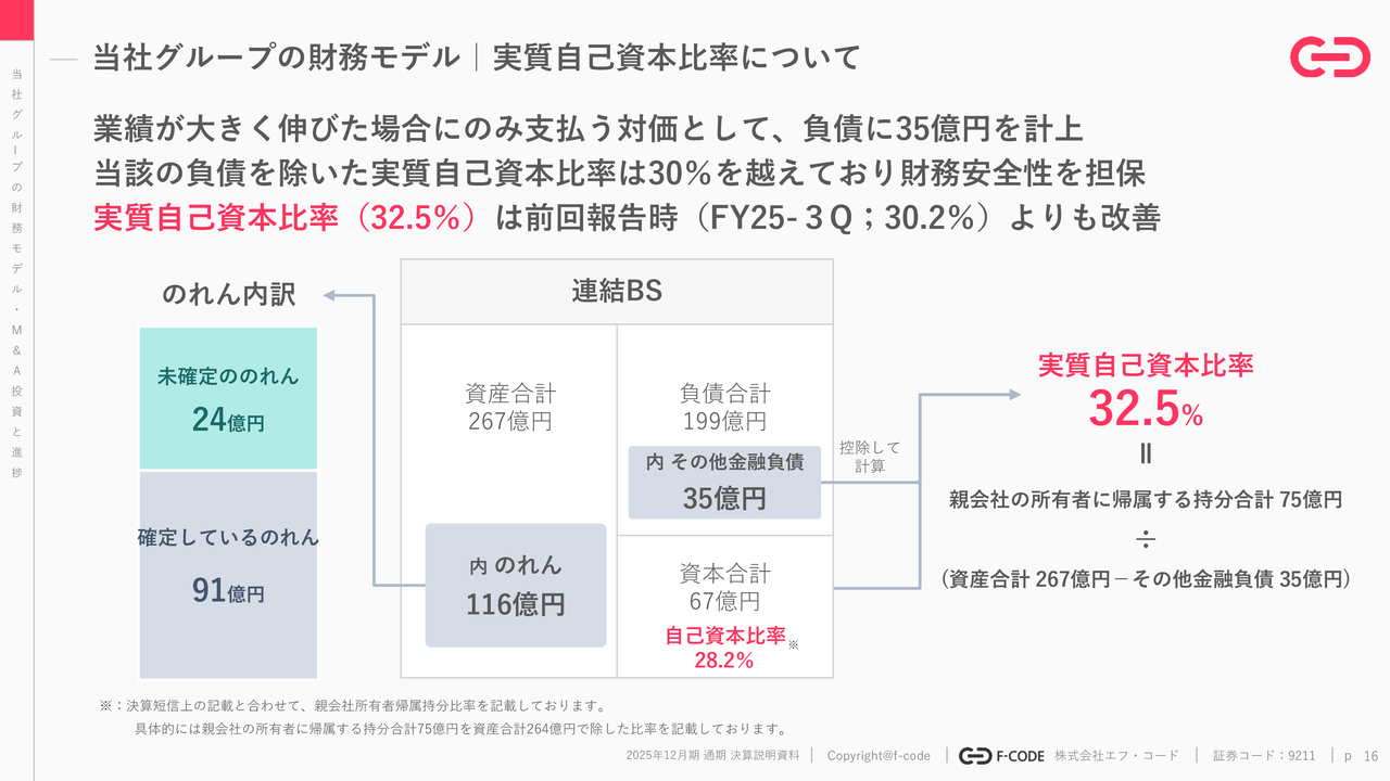 実質自己資本比率についてです。スライドのバランスシートの右側をご覧ください。少しわかりづらい点があるので、ご説明します。当社は「その他金融負債」を35億円持っています。こちらは、バランスシート左側の「未確定ののれん」に対応するところです。