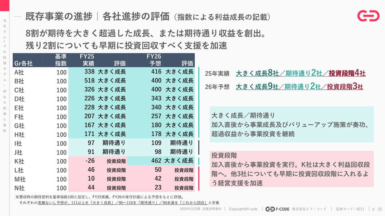 スライドをご覧いただければ、しっかりと成果が出ていることが、すぐにおわかりいただけると思います。M&Aの発表のたびに「想定している売上利益はこうです。想定ではこのぐらいの回収年数です」と開示しています。そのM&A時の期待値を100としたときの指数が、スライドの上段です。また、M&A前のその会社の当該実績を100として表したのが、スライドの下段です。