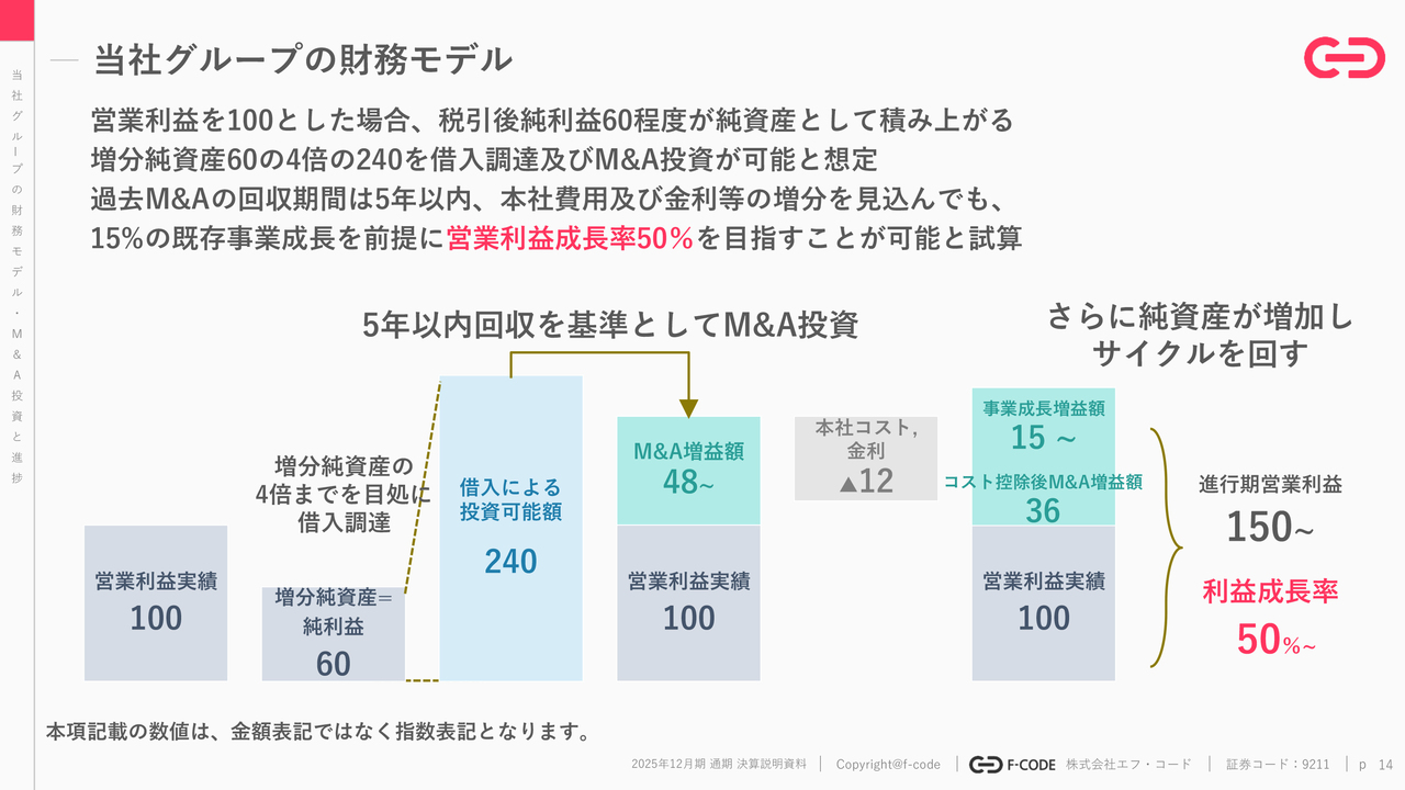 2025年12月期はオーガニックだけで35パーセントグロースしています。今後のモデルとして極めて保守的に、オーガニックグロースレートが15パーセント程度にとどまったとしても、インオーガニックとの合算で50パーセント以上の営業利益成長率を達成できると考えています。そのような想定で、財務モデルを組んでいこうと考えています。