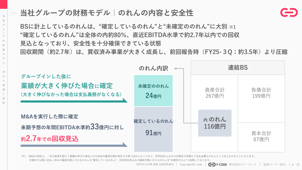 なお、確定しているのれんに対する回収期間は、買収後の事業が大きく成長し先行投資期間だった事業が回収フェーズに入ったこともあり、前回報告時(2025年12月期第3四半期)には3.5年程度だったものが、今回約2.7年と大きく短縮されています。財務的安全性は増しているという認識です。