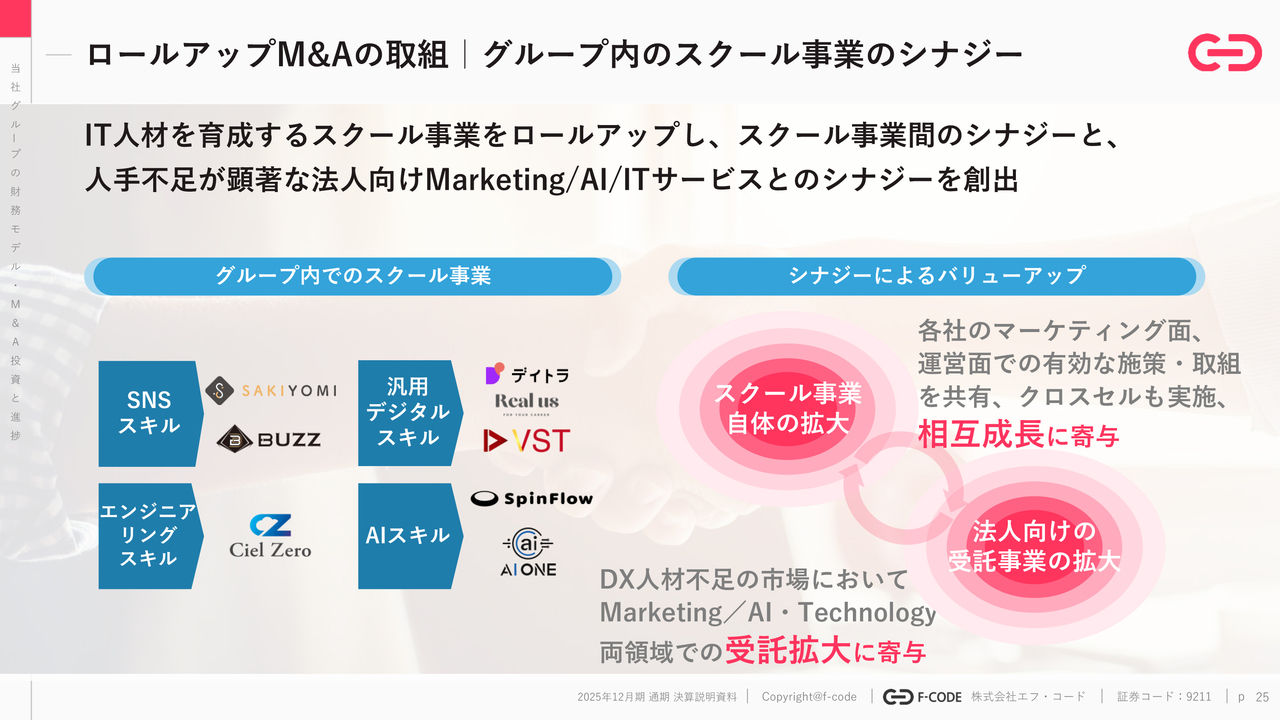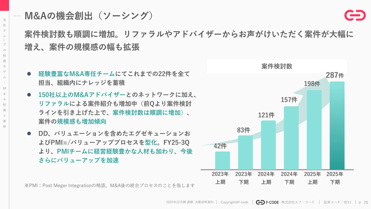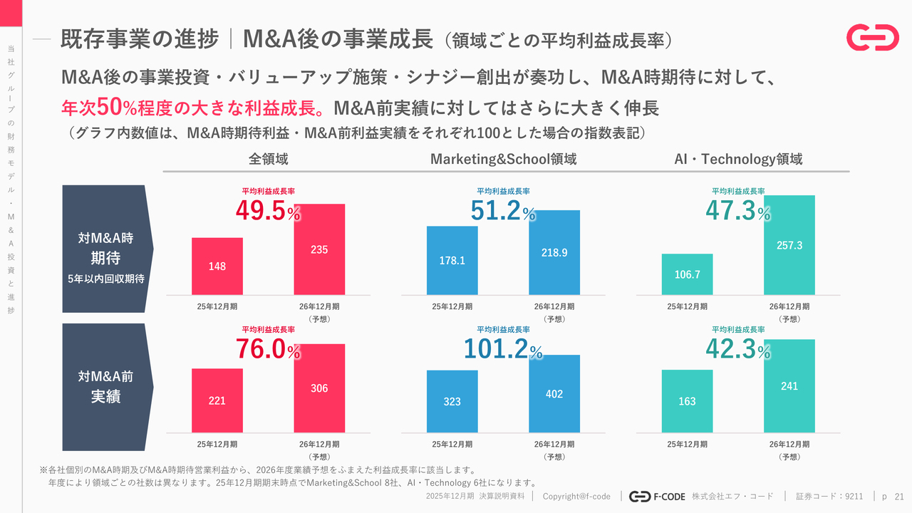 2025年12月期におけるM&Aは、合計6件実行しました。また上場以降M&Aした事業が、年次で50パーセント程度の力強い成長をしていることも今回ハイライトしたいところです。