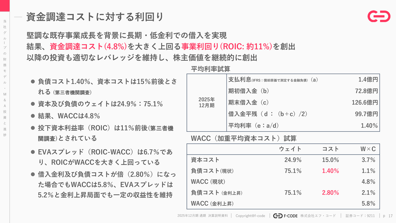 WACCとROICについてです。スライドでは「想定されるROICに対して長期かつ低金利の融資をしっかりと利活用することによって、WACCを確実に抑えられている」ということを示しています。