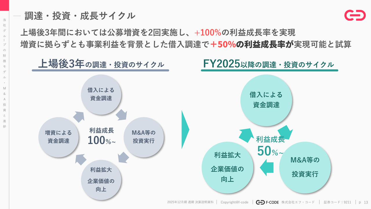 スライド左側の公募増資、エクイティを活用して100パーセントの利益成長を達成するモデルから、スライド右側の営業キャッシュ・フローと借入で利益成長率プラス50パーセントのグロースを実現していくモデルへ切り替えを図っていきたいと考えています。