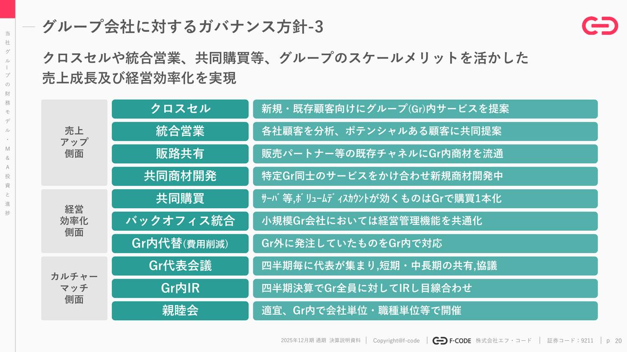 バリューアップ策についてです。グループ会社の数も非常に増えてきましたので、1つのお客さまに複数のグループ会社のソリューションを販売できるよう、クロスセリングや販路共有、統合営業を行っています。またバックオフィスの統合や共同購買、さらには購買経路のグループ内代替も実施しています。