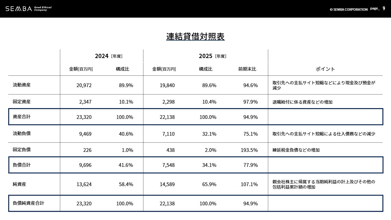 純資産は前期末比9億6,500万円増加し、145億8,900万円となりました。自己資本比率は65.9パーセントです。