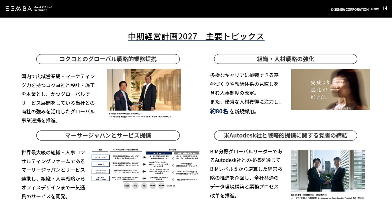 中期経営計画を推進する中での主なトピックスをご紹介します。当社サービスのさらなる進化のため、各分野のトップ企業とのアライアンスを拡大し、マーサージャパン社、コクヨ社、Autodesk社等との提携を進めてきました。