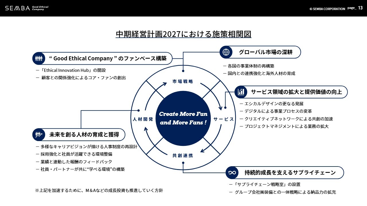 これらの施策は、人材開発、市場戦略、当社サービス、共創連携と連動しているため、経営陣がハンズオンで関与し、スピーディに推進していきます。また、各施策のさらなる加速を目的としたM&Aなどの成長投資を進め、事業成長・拡大に努めています。