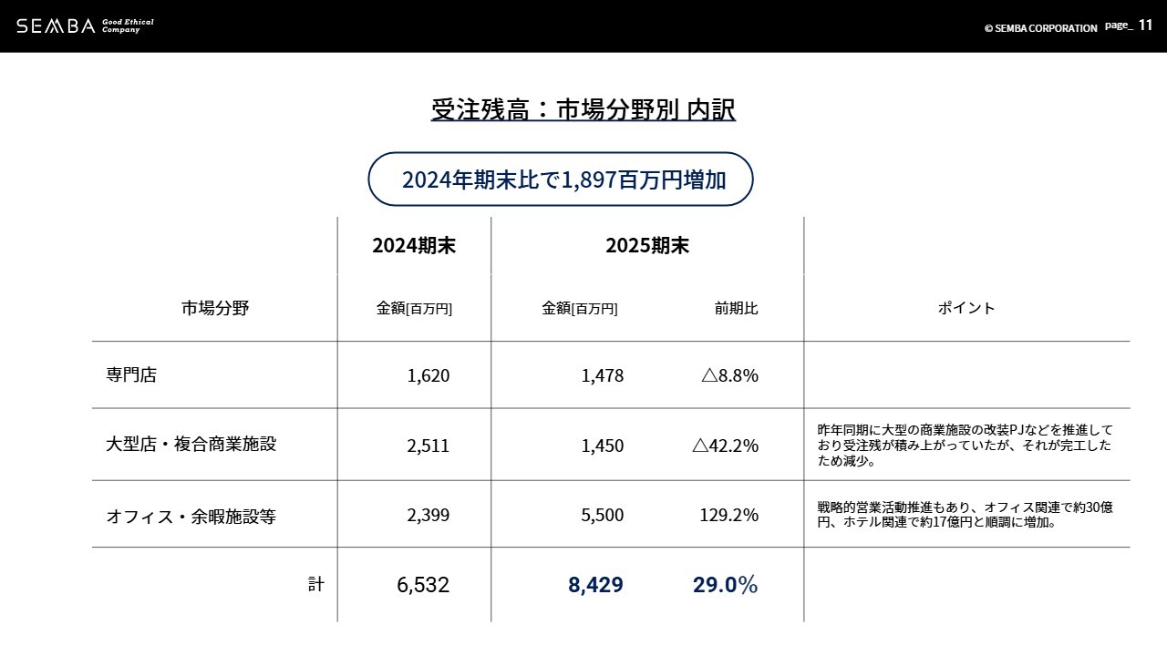 受注残高です。大型店・複合商業施設は、前年同期に商業施設の改装プロジェクトなどを推進し受注残が積み上がっていましたが、それが完工したため減少しました。