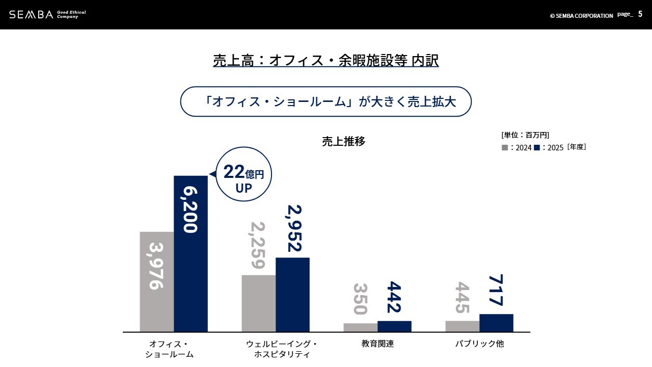 オフィス・余暇施設等の内訳はスライドのとおりです。各セグメントで売上は伸長していますが、中でもオフィス・ショールームは昨年比22億円増加し、売上拡大が継続しています。