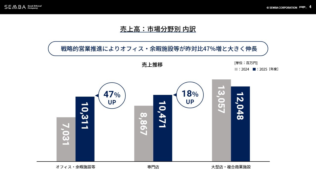 市場分野別の売上高では、オフィス・余暇施設が昨年比47パーセント増と大きく伸長しました。また、専門店分野も18パーセント増と売上を伸ばすことができました。