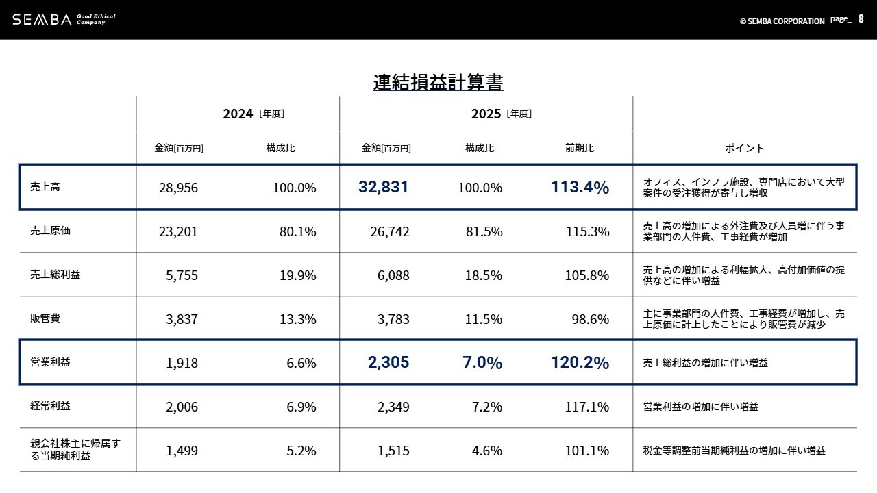 当社を取り巻く事業環境では、企業の好業績やインバウンド需要の増加を背景に、商業施設、オフィス、ホテル、インフラ関連施設など、各企業の設備投資が活発化しています。このような状況の下、戦略的な営業推進や売上拡大に向けた体制強化の取り組みが増収・増益につながりました。