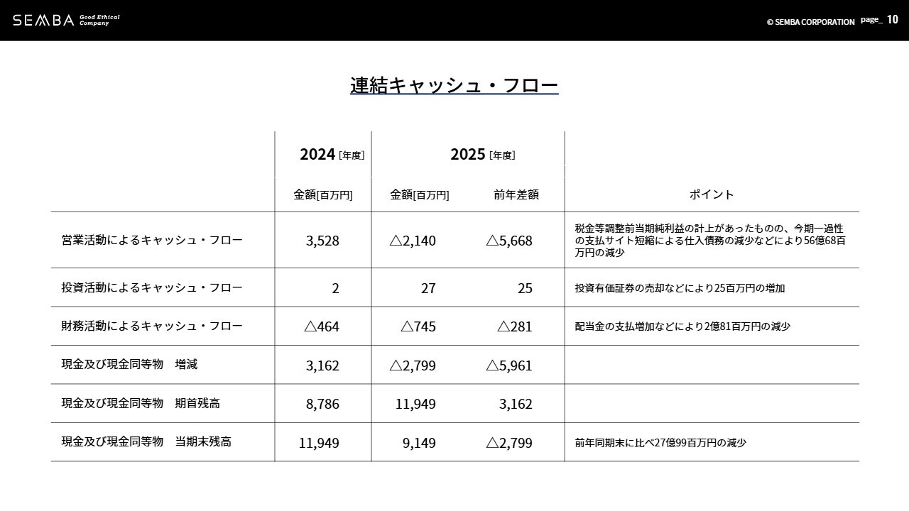 投資活動によるキャッシュ・フローは2,500万円増加し、2,700万円の収入となりました。財務活動によるキャッシュ・フローは、配当金の支払増加などにより2億8,100万円減少し、7億4,500万円の支出となりました。