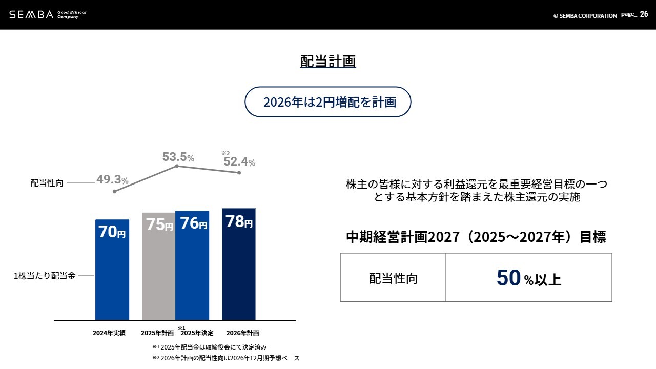 2025年の配当は1株当たり76円とし、前年実績から6円の増配を決定しました。当社は、株主のみなさまへの利益還元を最重要経営目標の1つとする基本方針に基づき株主還元を実施しており、「中期経営計画2027」の期間中の目標として配当性向50パーセントを掲げています。これらを踏まえ、2026年は2円増配の1株当たり78円の配当を計画しています。