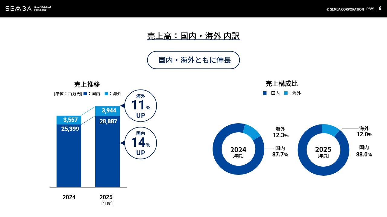次に、国内と海外の売上高についてです。売上比率に大きな変化はありません。売上高は国内が昨年比14パーセント増加の288億8,700万円、海外が昨年比11パーセント増加の39億4,400万円となり、いずれも伸長しました。