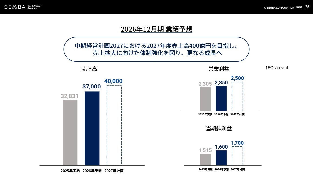 以上の昨年度実績を踏まえ、今年の業績予想をご説明します。「中期経営計画2027」における最終年度の業績目標である売上高400億円、営業利益25億円、純利益17億円に向けて、今期も売上拡大に向けた体制強化を図り、さらなる成長を加速させていきます。
