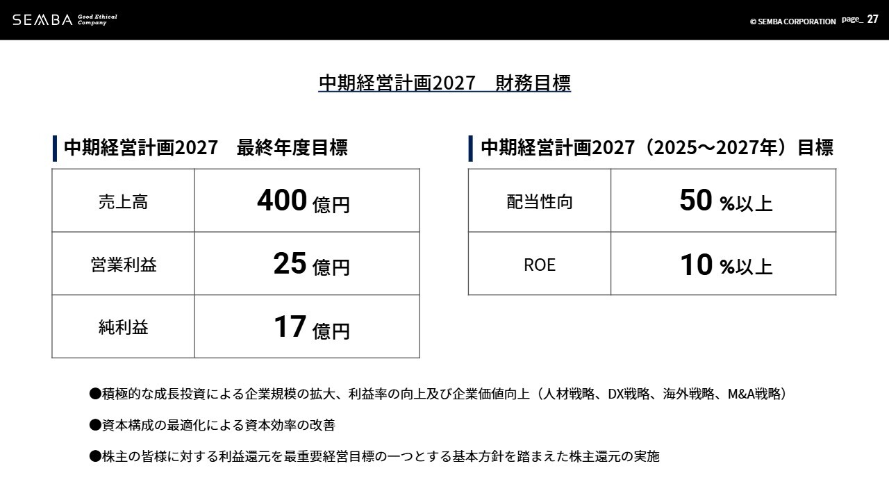 最後に、現在推進中の「中期経営計画2027」の主要財務目標についてあらためてお伝えします。スライドに記載の数字を達成できるよう、役職員一丸となって各施策を推進していきます。