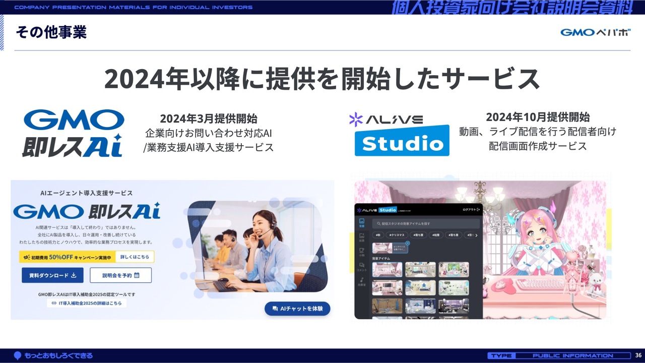 回答:新規領域では「AI」と「クリエイター支援」の2軸で新たなサービス展開をしています。AIを活用した企業DX支援サービス「GMO即レスAI」や、VTuber・配信者向けの配信画面デザインサービス「Alive Studio」などを提供しており、「Alive Studio」は既に1万5,000人を超えるユーザーさまにご利用いただいています。