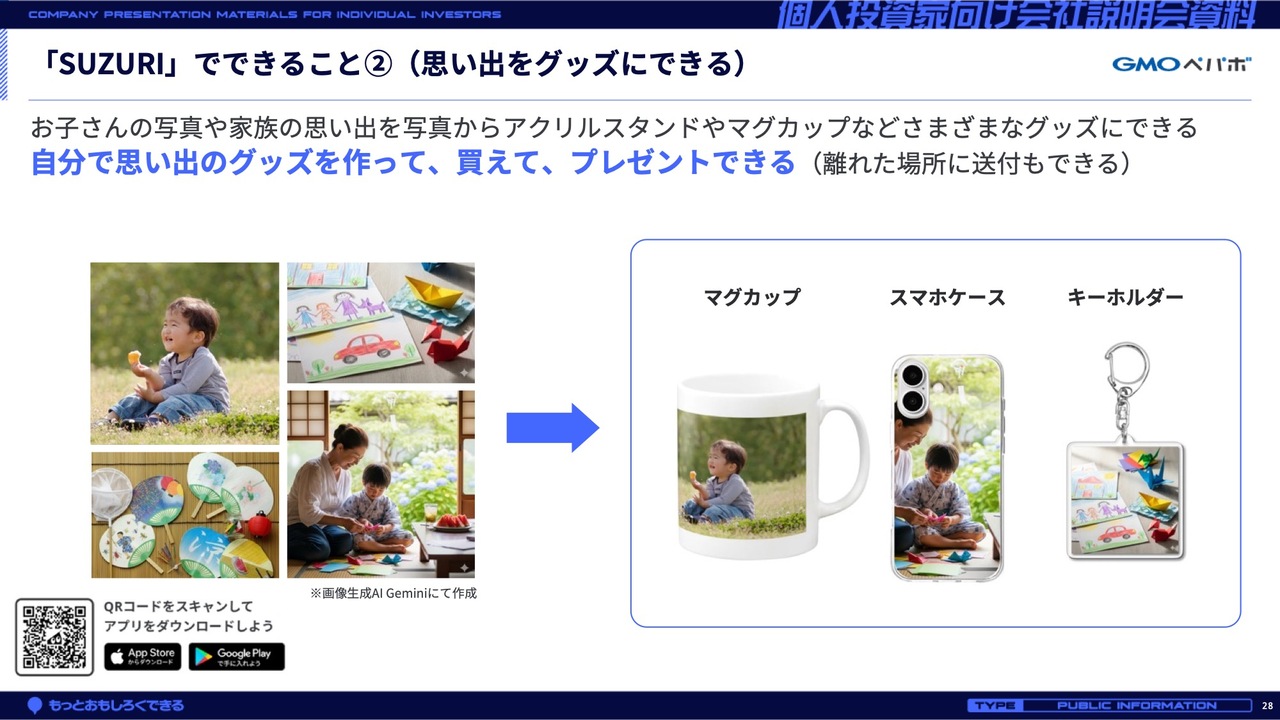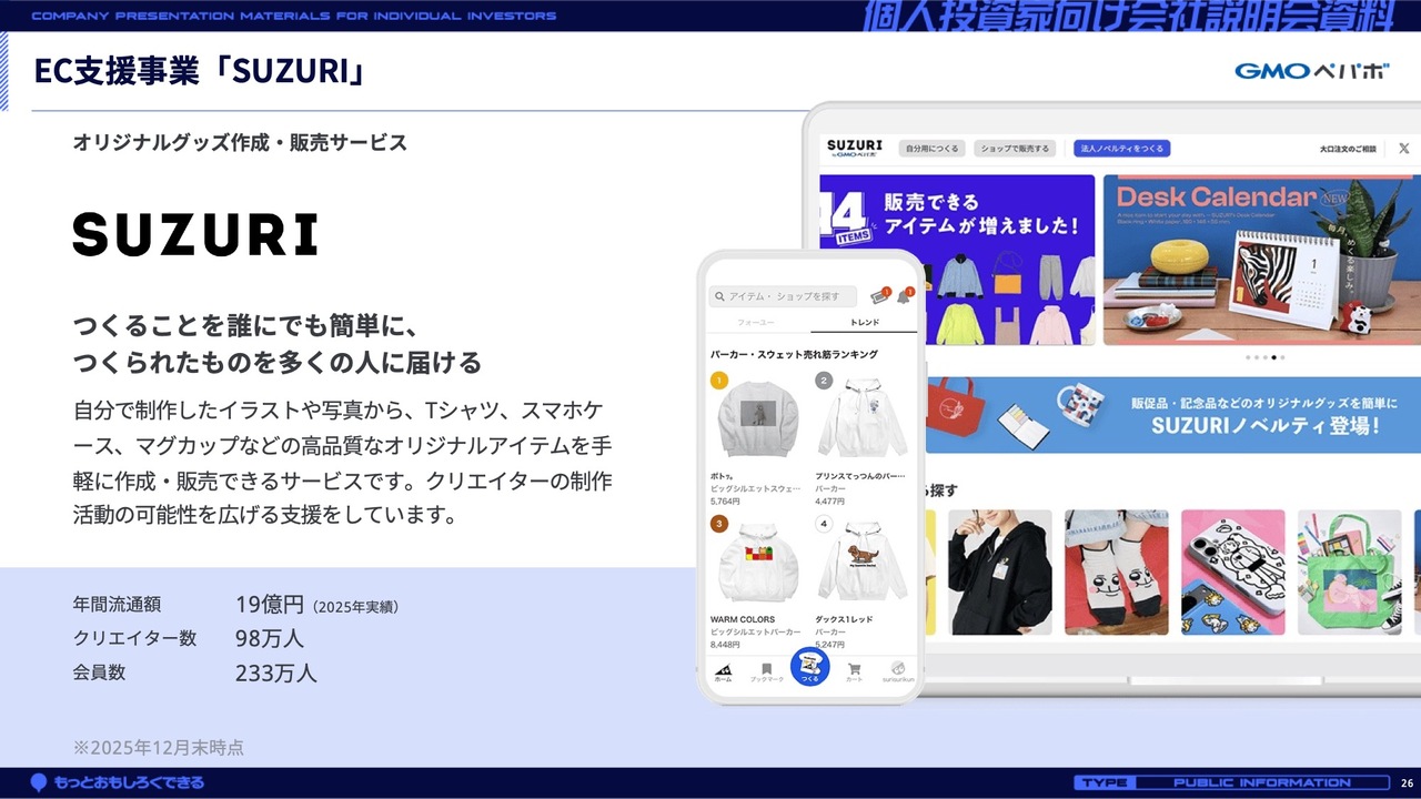 回答:個人の表現活動が日常化する中で、「SUZURI」には依然として大きな成長余地があると考えています。現在はオリジナルグッズの作成・販売サービスとしての強みをさらに活かすべく、拡大する「自分買い」需要(自分でオリジナルグッズを作成し、自分で購入または友人・家族にプレゼントする)と法人向け「ノベルティ」需要を取り込んでいく所存です。