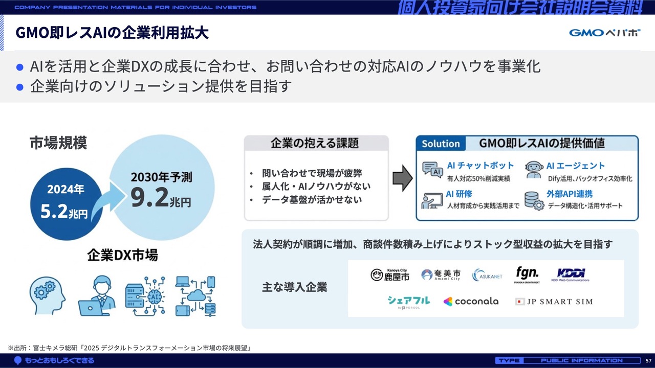 坂本:「GMO即レスAI」の機能がどのように利用可能なのかはスライドに記載されていますが、企業利用が現状どのように拡大しているのか、また、将来的にはどのような場面で使えるのかを含めて教えていただけますか?